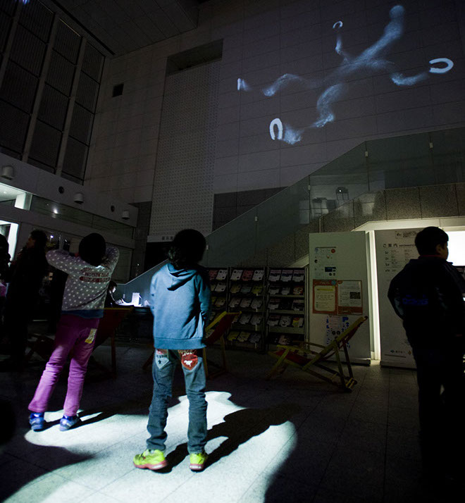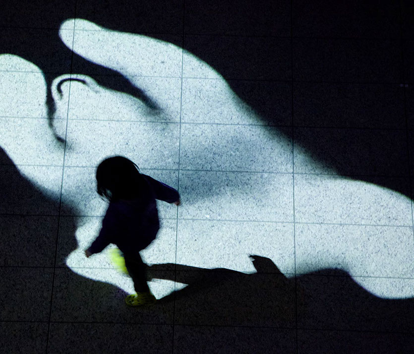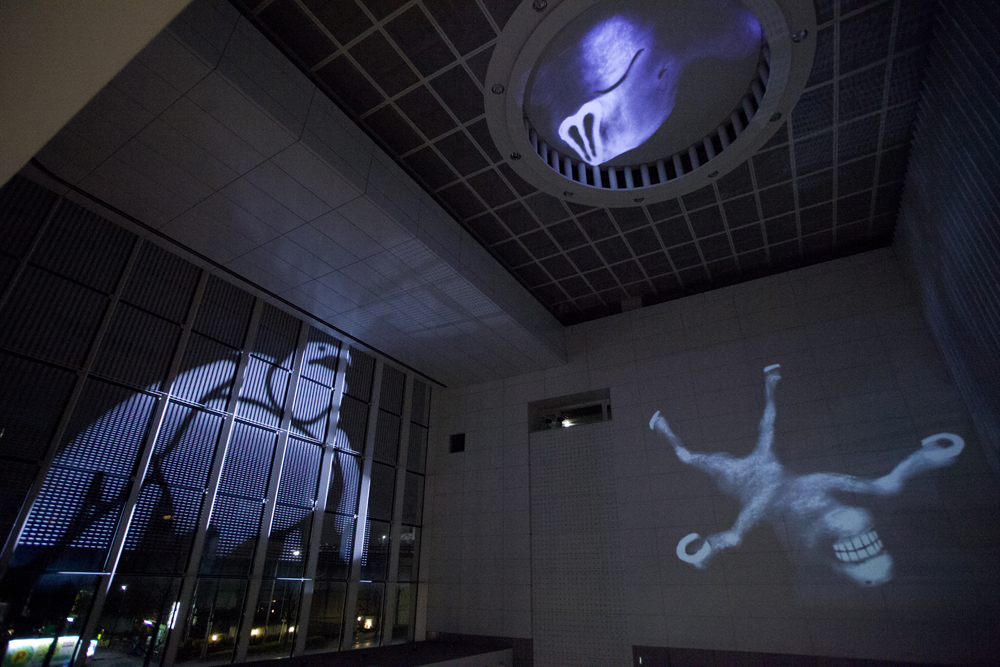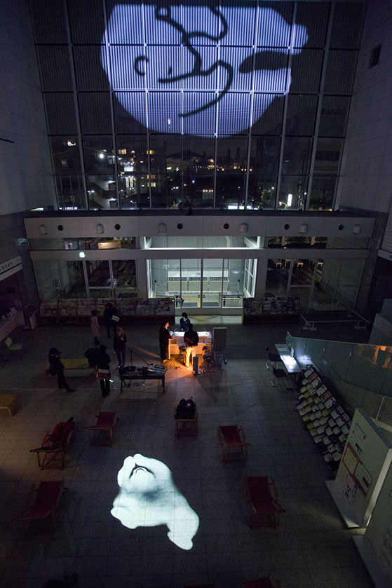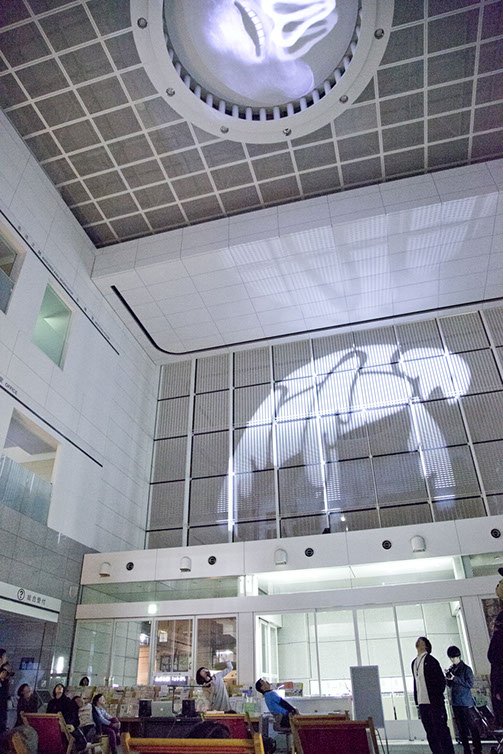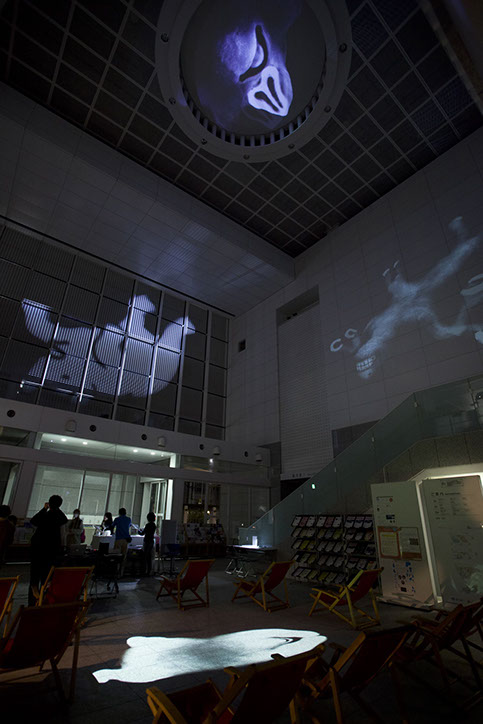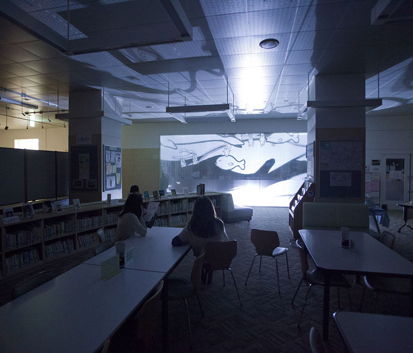 横浜市民ギャラリーあざみ野にて開催された、あざみ野ナイト「いけあさみのあざみのビックアニメーションパーティ!!」では、アートフォーラムあざみ野の大きな吹き抜け空間を利用し、「おちるみな」「うえのぞう」「したのくま」「まわるうま」の4つのアニメーションを大きく投影し、音と光が混ざり合う映像でできた遊具として一夜限りの空間をいろどりました。